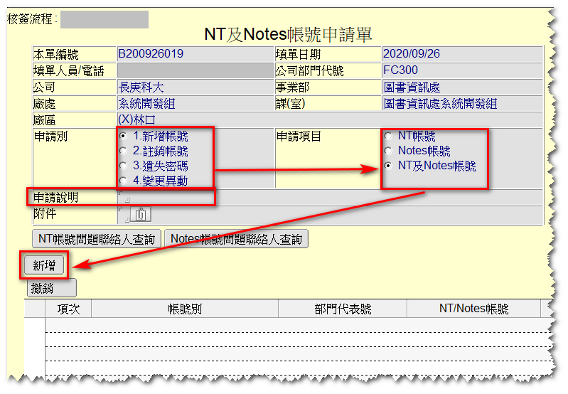 Step1. 進入辦公室自動化 / 選擇「資訊管理」 / 「NT及Notes帳號申請單」