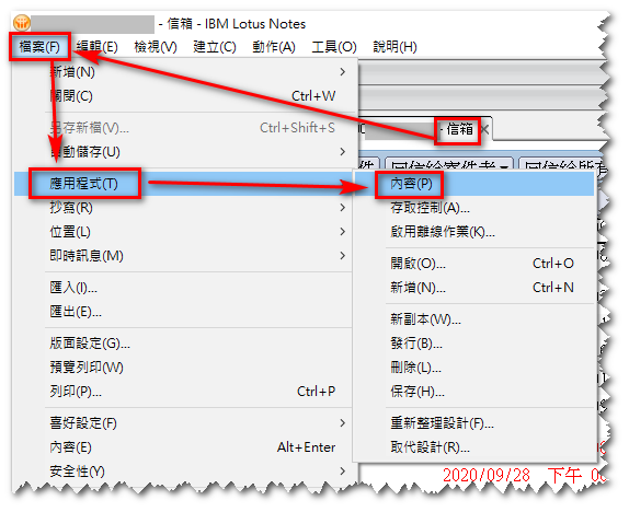 Step1. 開啟【信箱】,點選「檔案」/「應用程式」/「內容」