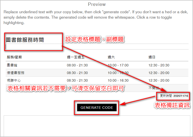 06.設定表格標題、副標題、表格備註資訊後,點選「GENERATE CODE」
