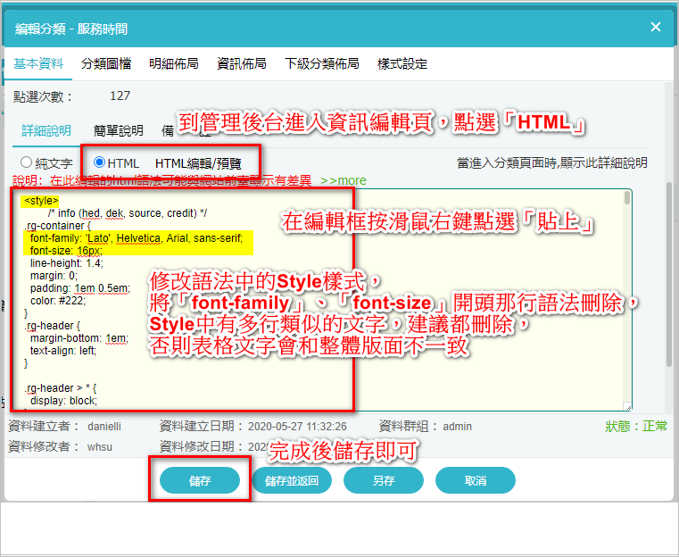 08.至管理後台資訊編輯頁貼上語法,刪除Style樣式裡的字體樣式語法,「儲存」即可