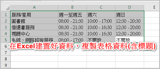 01.在Excel建置好表格資料,複製表格資料(含標題)