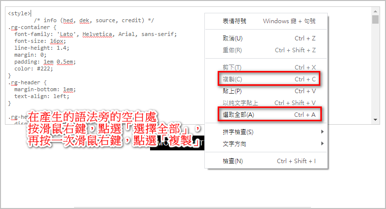 07.語法旁空白處按滑鼠右鍵點「選擇全部」,再按一次滑鼠右鍵點「複製」