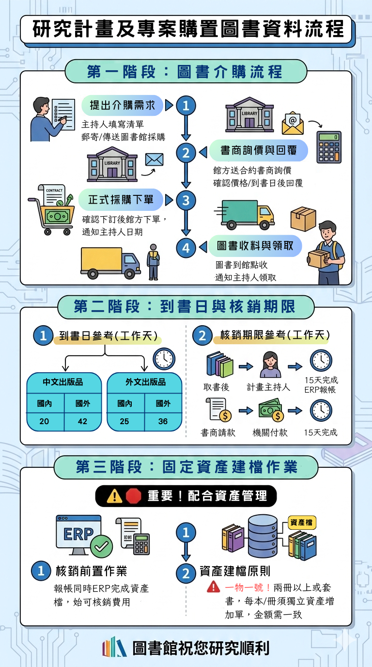 - 後續核銷作業:領取圖書後,由計畫主持人辦理後續的帳務核銷與資產建檔等相關作業。