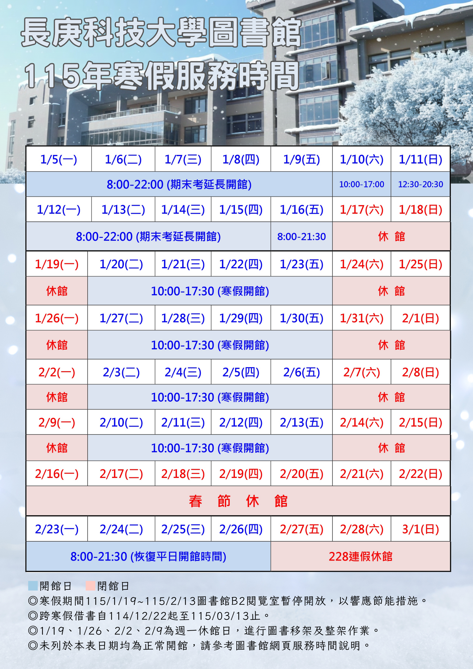 115年圖書館【寒假開館服務時間表】